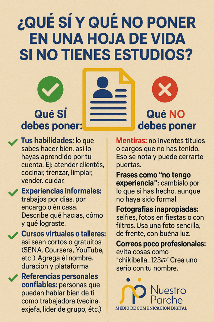 Puede destacar tu potencial, incluso si no tienes experiencia formal: Si eres nueva en el mundo laboral o tienes poca experiencia, una buena hoja de vida puede resaltar tus habilidades transferibles y tu potencial. Tal vez no hayas tenido un empleo formal, pero quizás has liderado proyectos comunitarios, administrado un pequeño negocio familiar o manejado muchas responsabilidades en casa. Todo eso puede mostrarse de manera positiva. Una hoja de vida impecable te permite brillar por tus competencias, logros personales y formación, aunque tu historial laboral sea breve. (Por ejemplo, podrías enfatizar tu rápida capacidad de aprendizaje, tu responsabilidad o cualquier logro académico/comunitario). En resumen, un buen CV abre puertas incluso a quien está empezando.